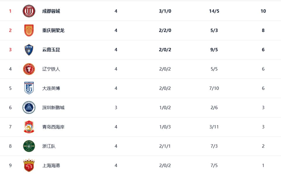 前4轮之后,成都蓉城以10分排名榜首,重庆铜梁龙以8分排名第2位,云南玉昆、辽宁铁人、大连英博分别以6分排名其后。