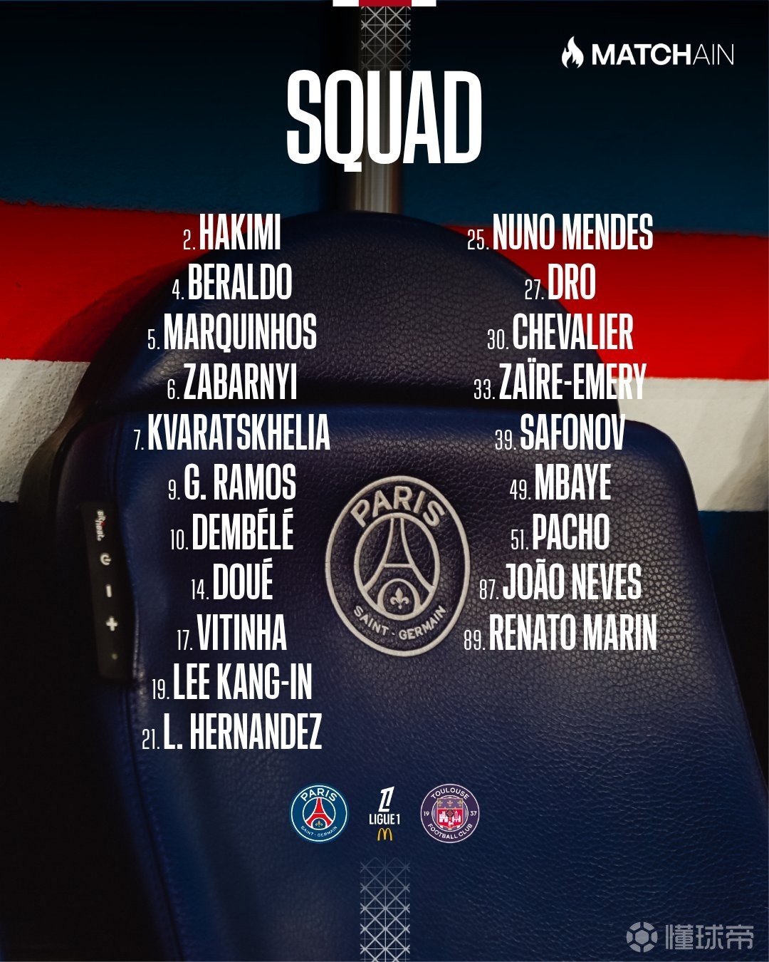北京时间4月3日,巴黎官方公布联赛第28轮主场对阵图卢兹的大名单,登贝莱领衔,马尤卢缺阵,阿什拉夫、内维斯回归。
