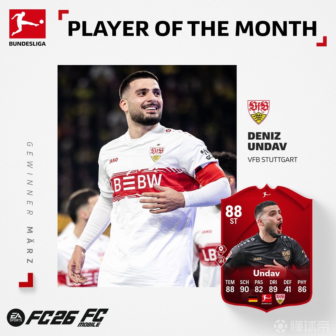 官方消息,斯图加特前锋昂达夫当选德甲3月最佳球员。