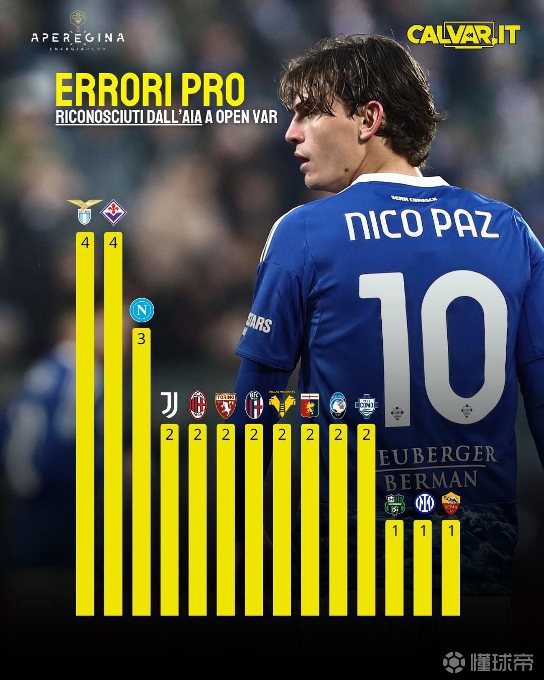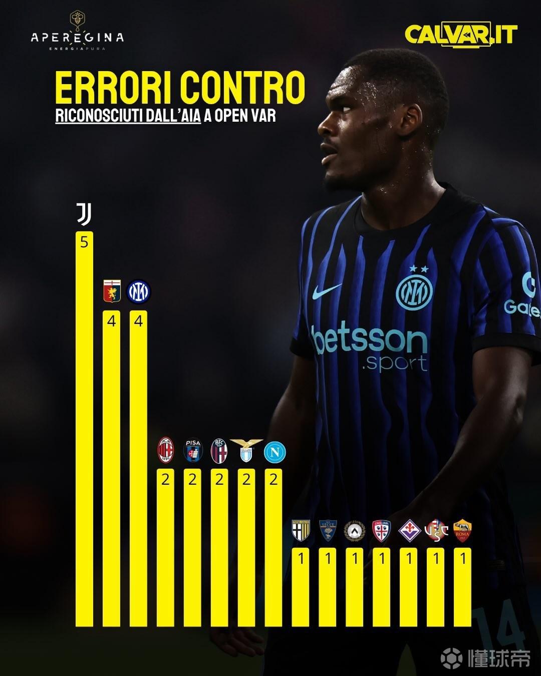 北京时间4月15日,意大利媒体Calvar.it统计出了本赛季至今意甲球队遭遇VAR误判的次数,尤文图斯5次位居第一,遭遇4次VAR误判的国际米兰目前仍以9分优势领跑积分榜。
