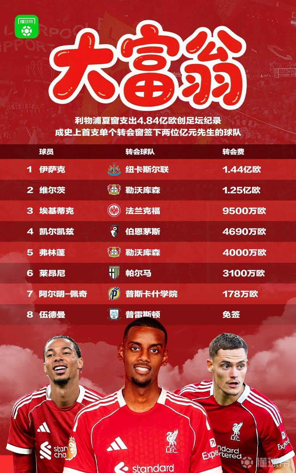 本赛季,利物浦以创队史纪录的4.8亿欧元引援投入组建豪华阵容,先后签下伊萨克、维尔茨、埃基蒂克等多名顶级球星。