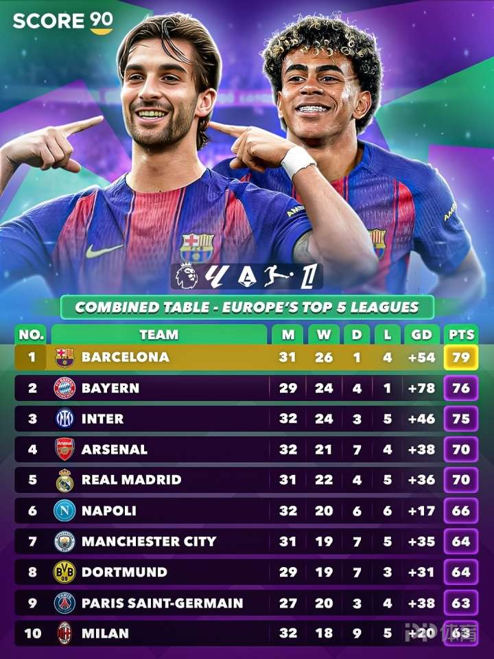Score90统计了目前五大联赛合并的积分榜,巴萨以79分位居第一,拜仁第二,国米第三,阿森纳第四。
