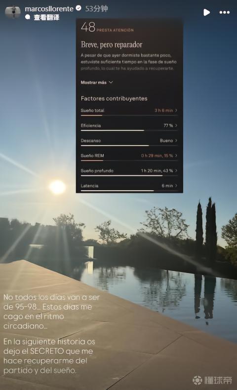 在分享了一张显示他睡眠质量不佳的截图后,略伦特解释了他的恢复方法:“不可能每天都睡到95-98分,最近我的生物钟有点紊乱……在我的下一条动态里,我会分享帮助我从比赛和睡眠不足中恢复的秘诀。”
