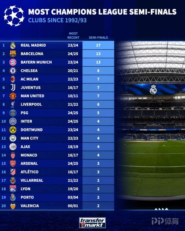 欧冠1/4决赛次回合即将打响,德转也盘点了自92/93赛季欧冠改制以来,进入4强次数榜以及各支球队上次进入4强的赛季,具体如下: