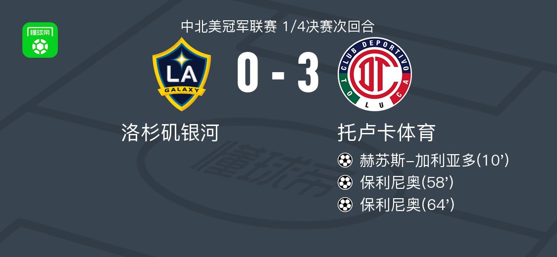 北京时间4月16日中北美冠军联赛 1/4决赛次回合,洛杉矶银河对阵托卢卡体育。托卢卡体育赫苏斯-加利亚多破门,保利尼奥梅开二度。最终比分洛杉矶银河 0-3 托卢卡体育。两回合总比分洛杉矶银河2-7托卢卡体育。