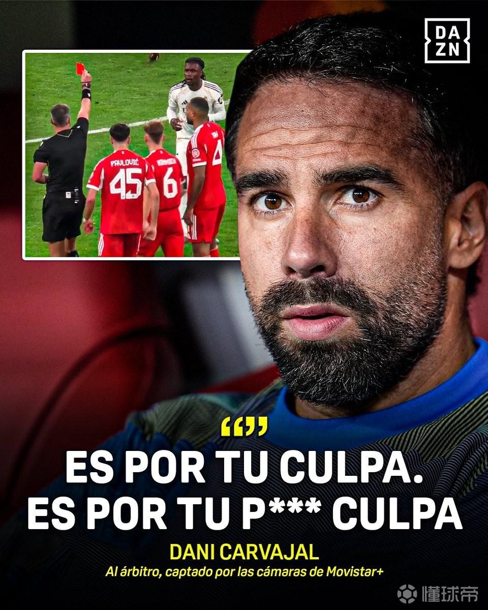 据DAZN的消息,本场比赛替补未登场的皇马后卫卡瓦哈尔被Movistar+的场边摄像机完整记录了他极度愤怒的一个瞬间,他对裁判说道:“这是你的错。这他X全是你的错。”