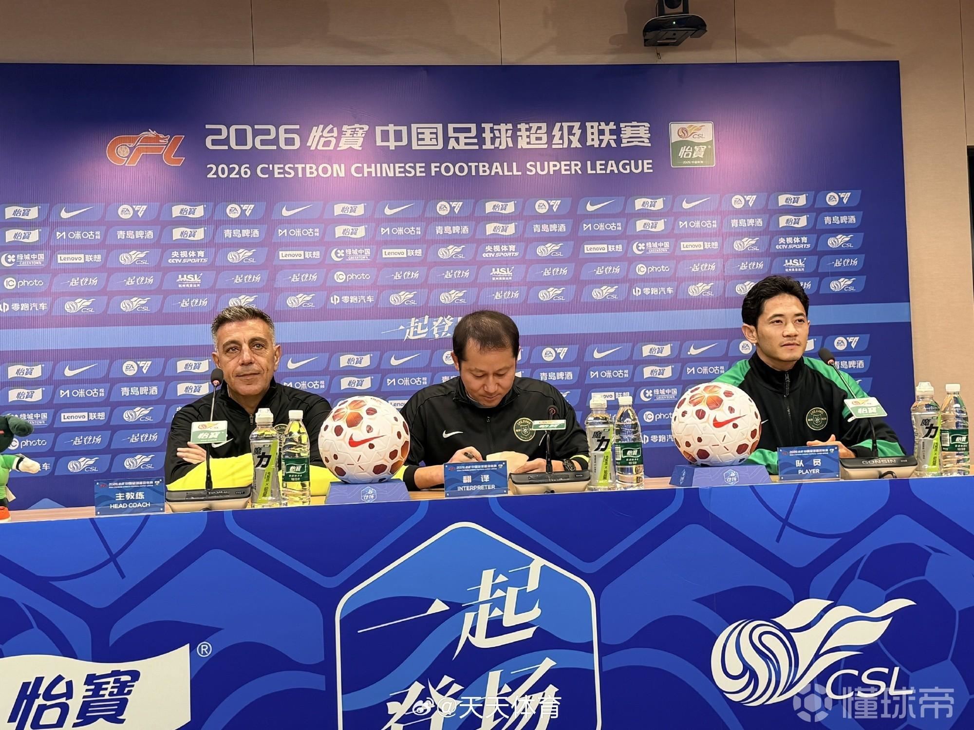 中超第六轮浙江队主场对阵北京国安赛前,浙江队主帅阿洛伊西携队员钱杰给出席赛前发布会。内容来自天天体育。