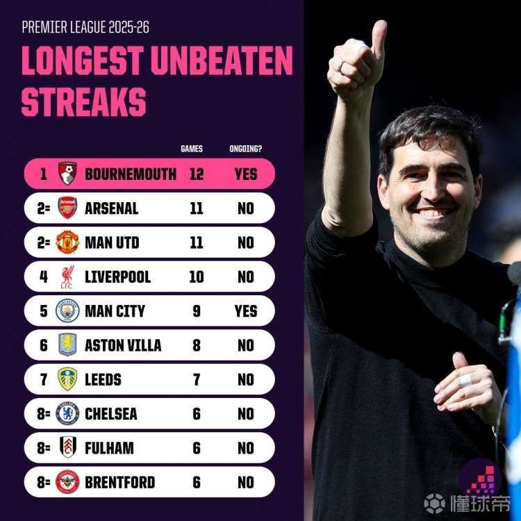 Opta统计本赛季英超连续不败场次最多的球队排名,阿森纳、曼联、利物浦、切尔西、曼城等球队在列。伯恩茅斯--12*阿森纳--11 曼联--11 利物浦--10 曼城--9*维拉---8 利兹联--7 切尔西--6 富勒姆--6 布伦特福德--6