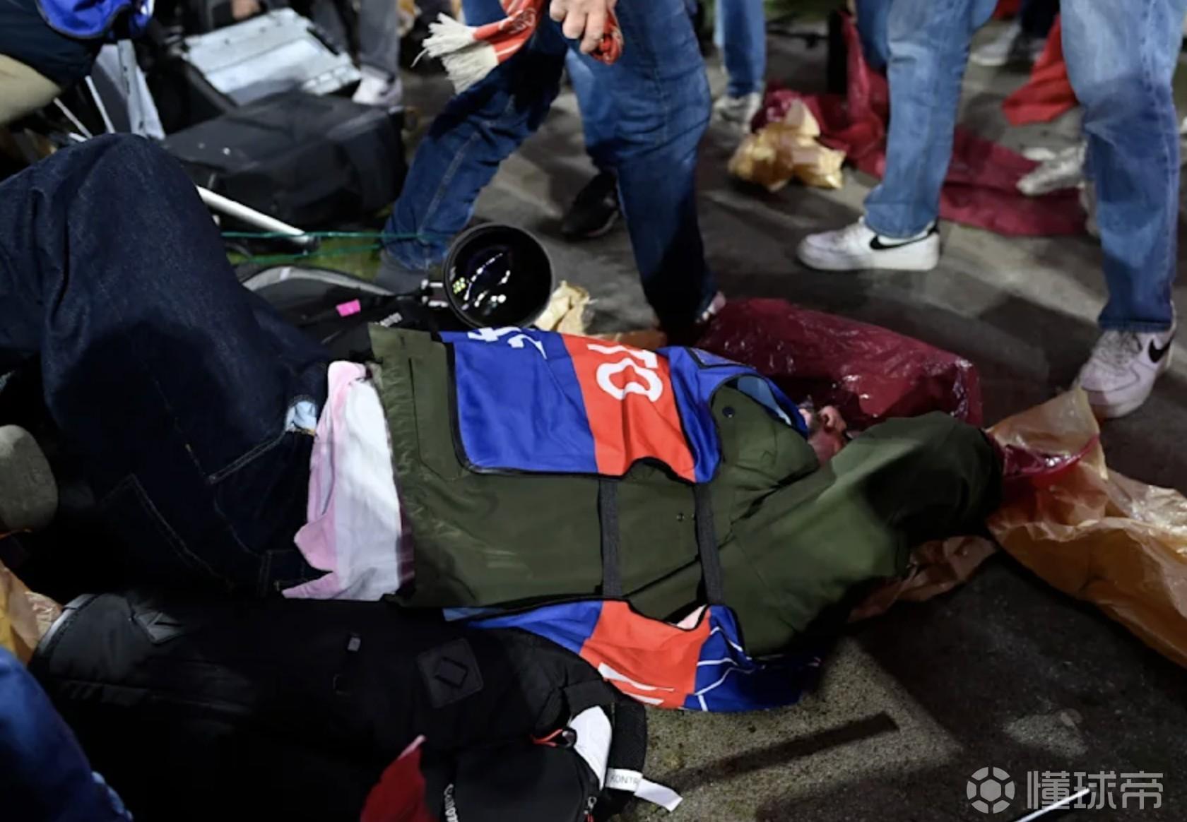 据现场描述,当医护人员发现他时,他正倒在地上,背景中还能看到红色的助威横幅,现场并没有明显出血的迹象。