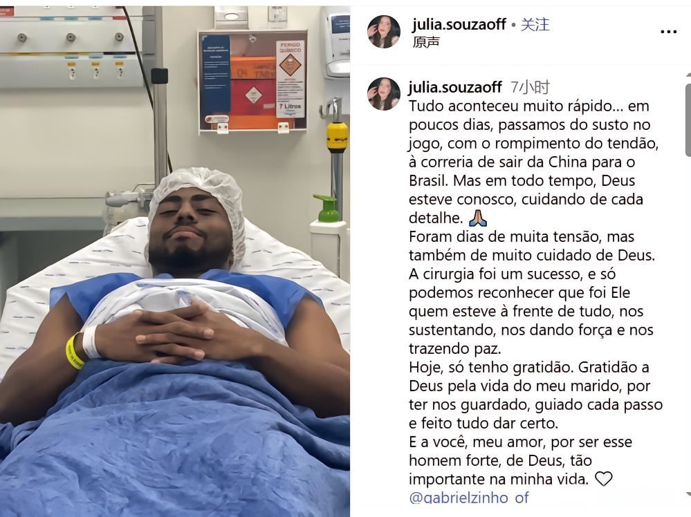 加布里埃尔的妻子在社媒中写道:“一切都发生得太快了……短短几天里,我们从比赛中肌腱断裂的惊魂未定,匆忙从中国奔赴巴西。但自始至终,上帝都与我们同在,守护着每一个细节。