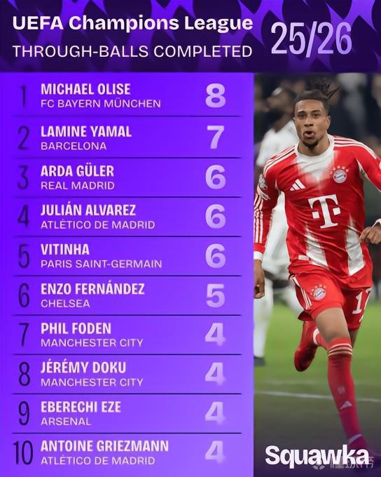 根据统计,本赛季到目前为止,奥利塞在欧冠当中成功送出了8记直塞球,位列该赛事第一,亚马尔位列第二。
