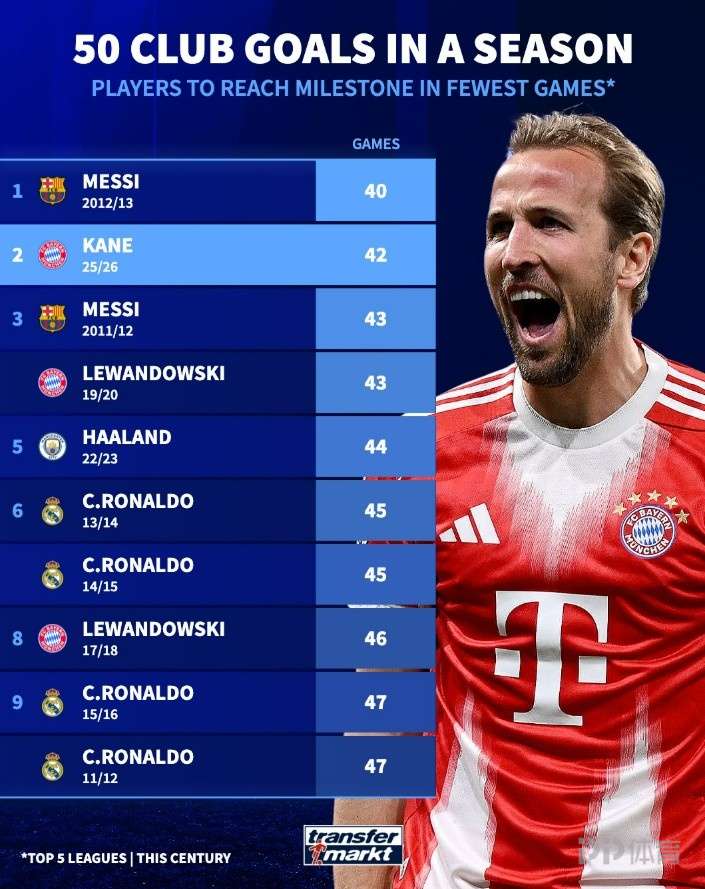 德转盘点了在本世纪五大联赛球员单赛季达成50粒进球最快纪录榜,其中本赛季凯恩42场位列次席。
