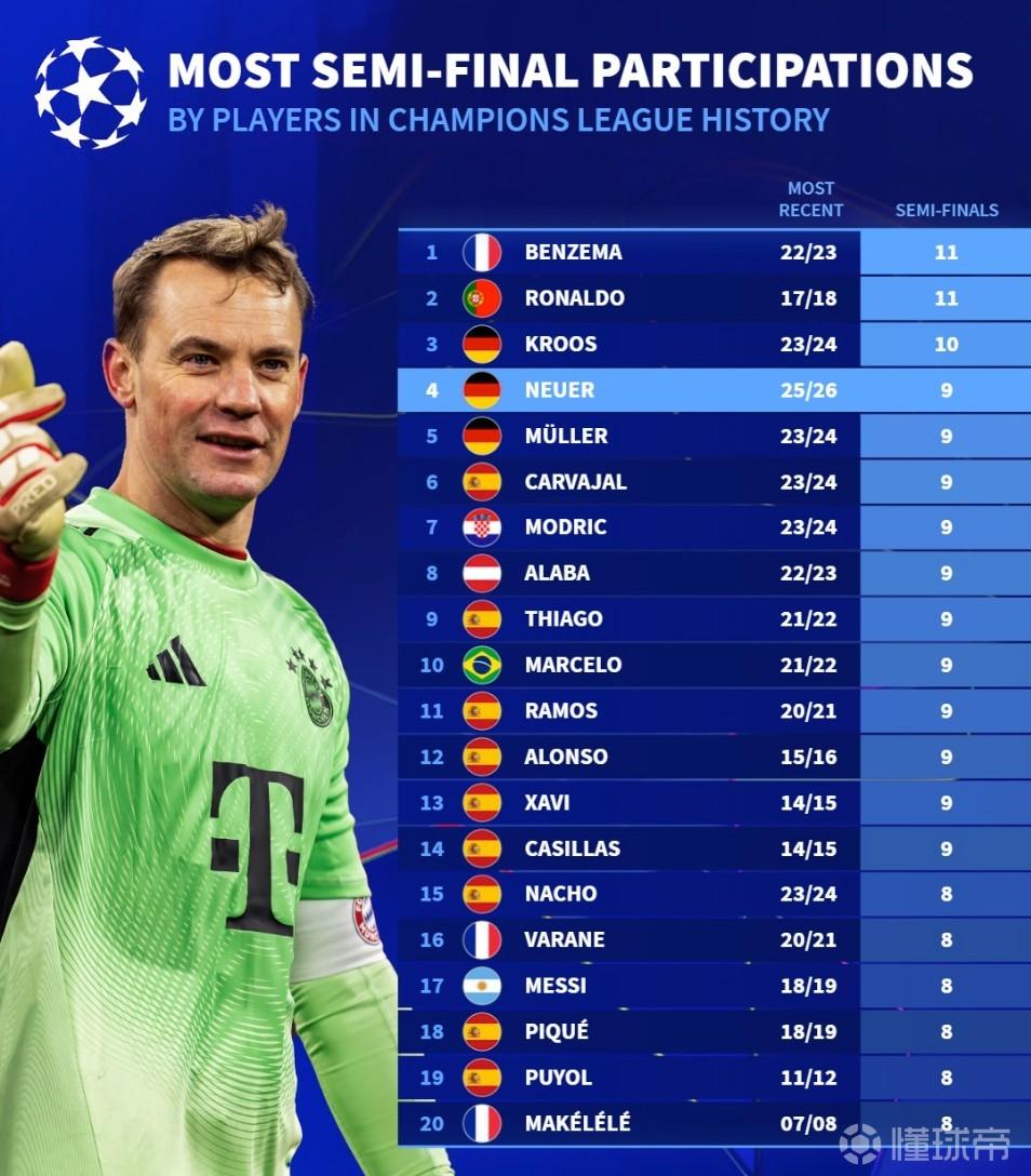 北京时间4月17日,德转统计出了欧冠历史上参加半决赛次数最多的20名球员,本泽马和C罗同以11次并列第一,此次帮助拜仁在1/4决赛淘汰皇马的诺伊尔以9次并列第四位。