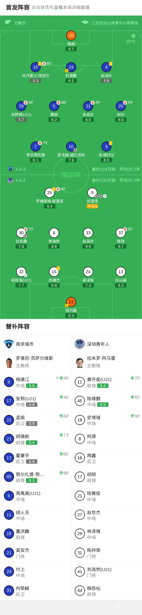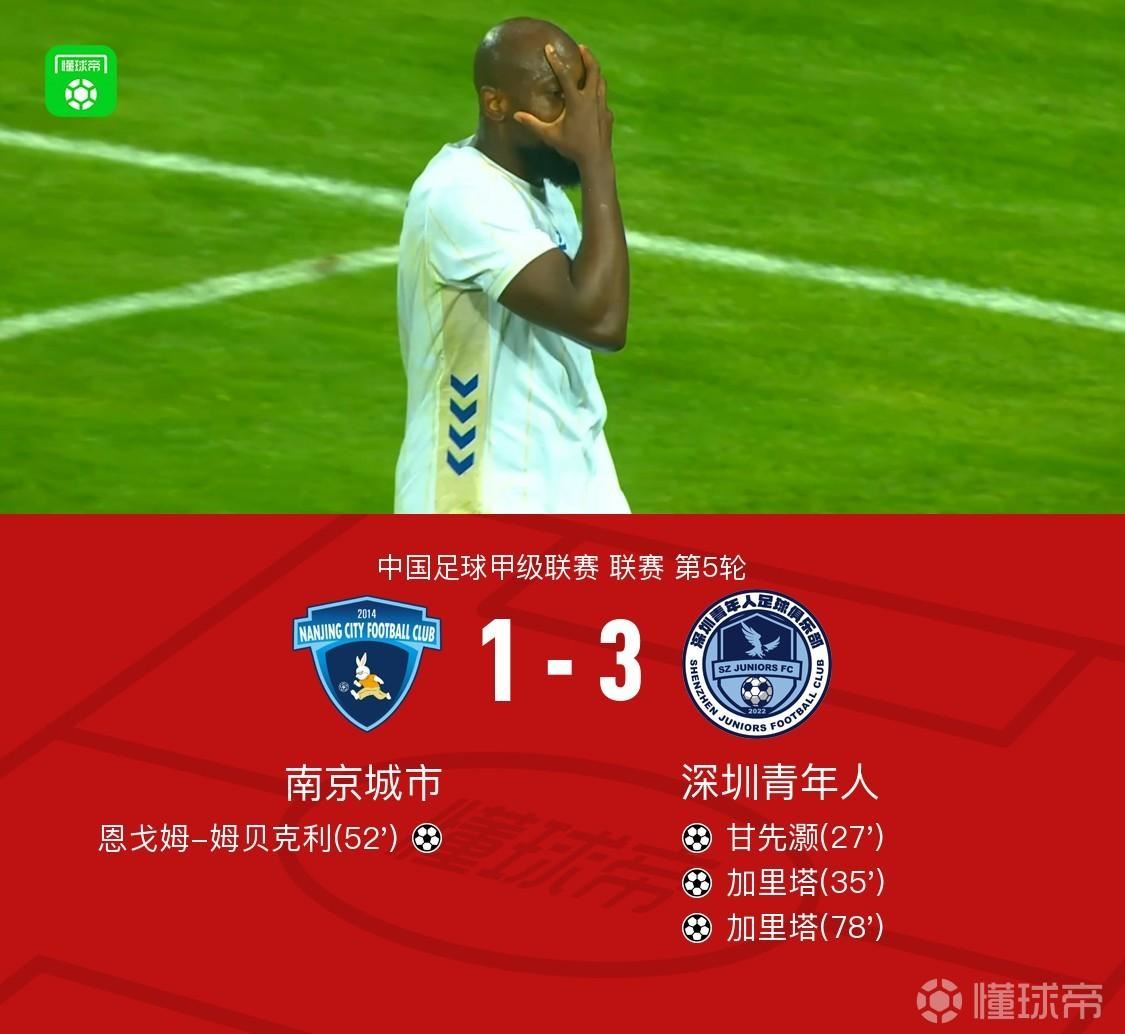 北京时间4月18日中国足球甲级联赛第5轮,南京城市主场对阵深圳青年人。上半场甘先灏首开记录,加里塔破门扩大比分,下半场恩戈姆-姆贝克利扳回一球,加里塔梅开二度。最终比分南京城市 1-3 深圳青年人。