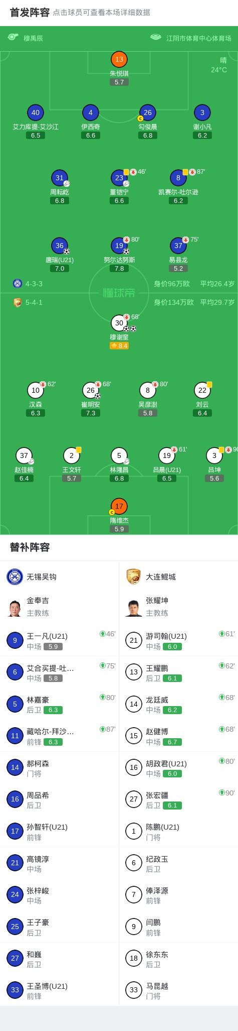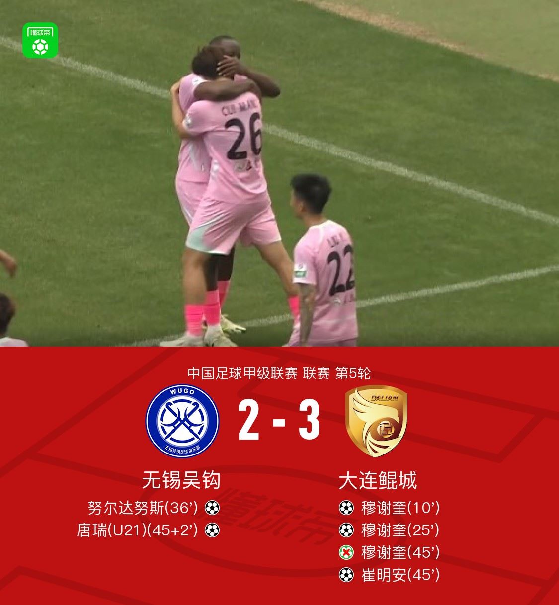 北京时间4月19日中国足球甲级联赛 联赛 第5轮,无锡吴钩主场对阵大连鲲城。无锡吴钩努尔达努斯破门,唐瑞破门。大连鲲城穆谢奎梅开二度,崔明安破门。最终比分无锡吴钩 2-3 大连鲲城。