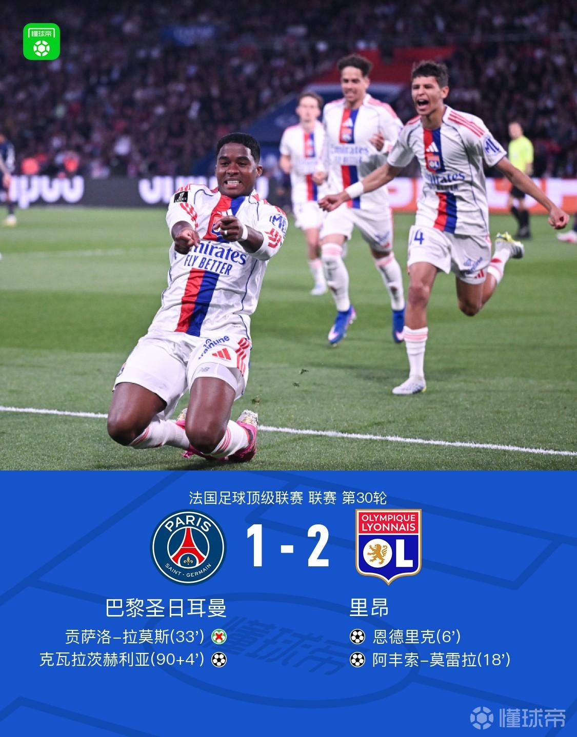 北京时间4月20日2:45,法甲第30轮,巴黎圣日耳曼主场对阵里昂。上半场,恩德里克抽射破门,随后恩德里克助攻阿丰索-莫雷拉扩大比分,贡萨洛-拉莫斯丢点,维蒂尼亚伤退。下半场,阿丰索-莫雷拉远射被扑出,克瓦拉茨赫利亚小角度打门被门将化解,登贝莱远射击中门框,克瓦拉茨赫利亚远射破门扳回一分,最终,巴黎1-2不敌里昂。
