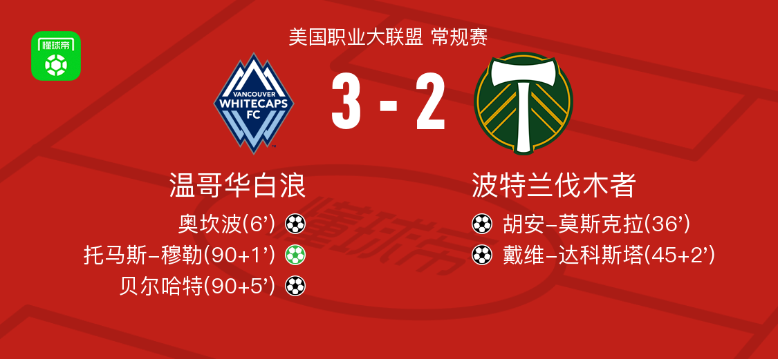 北京时间4月5日美国职业大联盟 常规赛,温哥华白浪主场对阵波特兰伐木者。温哥华白浪奥坎波破门,贝尔哈特破门,托马斯-穆勒破门。波特兰伐木者胡安-莫斯克拉破门,戴维-达科斯塔破门。最终比分温哥华白浪 3-2 波特兰伐木者。