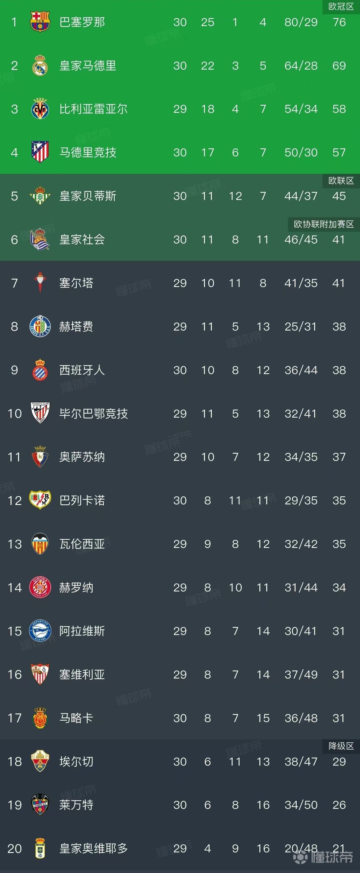 从第五名的皇家贝蒂斯(45分)开始,积分差距非常微小;第六名皇家社会积41分;第七名塞尔塔也积41分。对于欧联杯及欧协联资格的争夺,将进入白热化阶段。